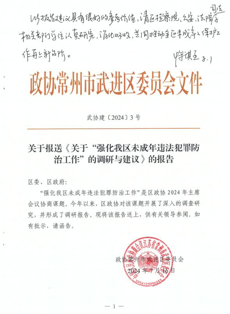 “此报告建议具有很好的参考价值,请区检察院、公安、法院、司法等相关部门单位认真研究、消化吸收,共同推动全区未成年人保护工作再上新台阶。”